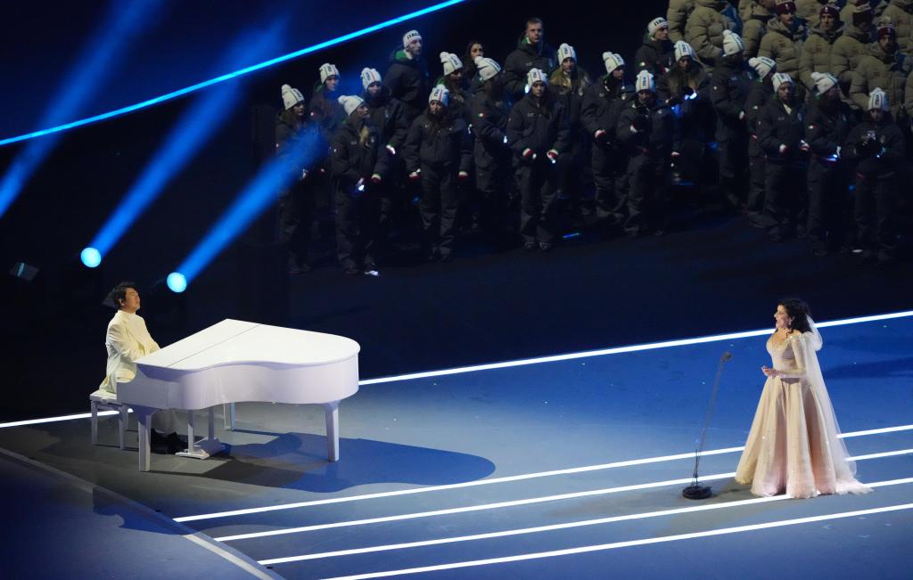 2月6日,中国钢琴家郎朗(左)和意大利歌唱家巴托莉在开幕式现场表演。新华社记者 赖向东 摄