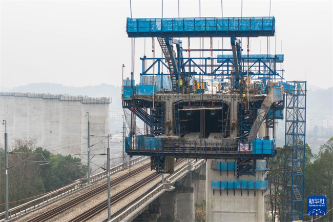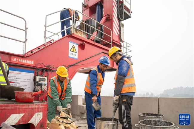 The photo shows construction workers from the China Railway No. 4 Engineering Group working at the construction site of the Xiaojipu Bridge on the Shaoyang-Yongzhou High-speed Railway. (Photo/Chen Sihan, Xinhua