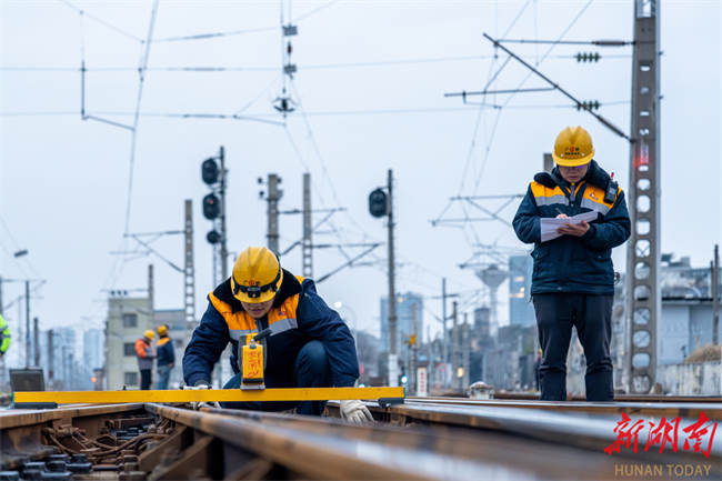 Technicians from the China Railway Guangzhou Group Hengyang Power Supply Section carry out a specialized overhaul of the overhead line equipment at the Hengyang Railway Station.A dedicated maintenance plan is implemented on this section during the Spring Festival travel rush period. Technicians increase the frequency of inspection in the key areas and critical equipment along the Beijing-Guangzhou conventional railway line, to ensure stable power supply for railway operation and safeguard journeys of travelers. (Photo/Zhou Xin and Xu Ziyuan)