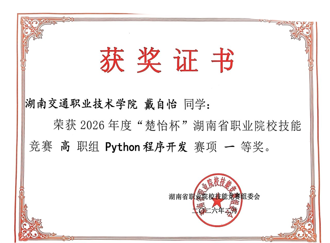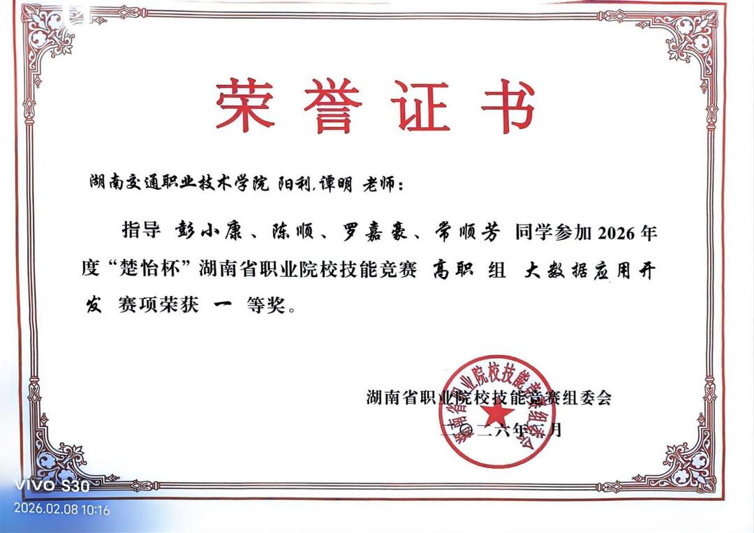 近日,2026年度“楚怡杯”湖南省职业院校技能竞赛高职组赛事顺利收官。湖南交通职业技术学院智能交通学院师生积极进取、奋力拼搏在多个赛项中荣获佳绩,充分彰显了学院在信息技术与智能交通融合领域的教学水平与人才培养成果。