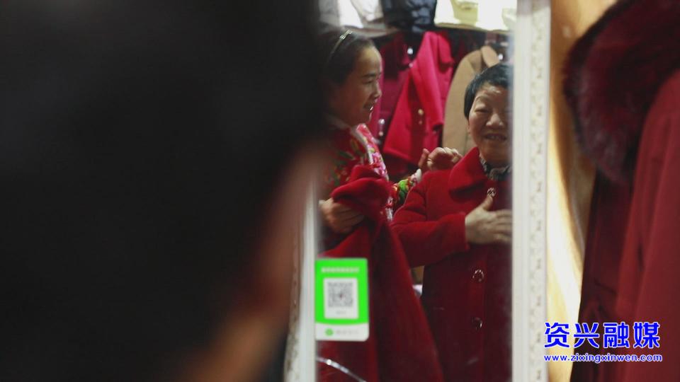 新衣添喜,新年纳福。在集市的服装区里,李贵兰早早便来挑选过年的新衣服,指尖抚过一件件新衣,认真比对着款式和尺码。“每年过年都会买新衣服,穿了新衣服,希望新的一年就有好兆头,喜气洋洋。” 在八面山瑶族乡,穿新衣迎新年是不变的年俗,一件崭新的衣服,不仅是对新年的仪式感,更是对美好生活的向往。服装摊位前,樊跃坤正忙着招呼客人,在这里她已经卖了30多年的衣服,虽因各种缘由,平日里的生意不如从前,但新春的到来,让集市重新热闹起来,生意也有了起色。“过年这段时间生意比以前更好做,买衣服的人也变多了。” 她笑着说。在她心里,新年最大的愿望,便是一家人平平安安、开开心心,简单的心愿,藏着对生活的安然与知足。