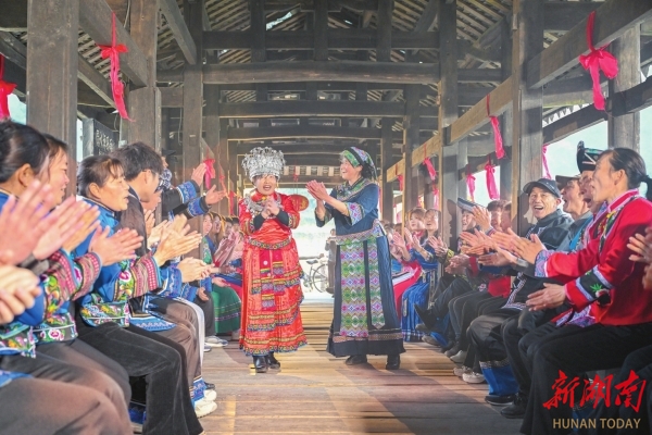 马头溪村村民在风雨桥上教学生唱土家山歌。