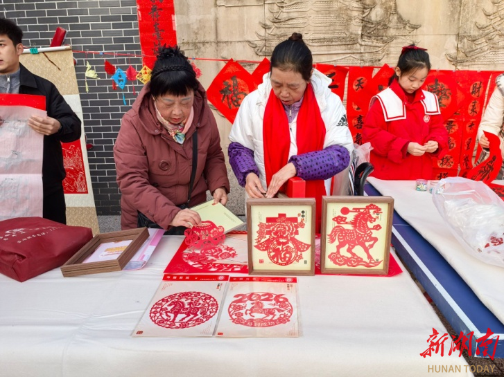 理论宣讲“声”入人心,非遗年俗体验区则是一片“热”气腾腾的景象。书法家们挥毫泼墨,一副副吉祥春联、一张张精巧福字窗花被村民欣然领走。石臼旁,打糍粑的号子铿锵有力;庖汤饭香气四溢,唤起人们对传统年味的记忆。特色美食区内,芷江酸萝卜、叶子粑等地方小吃供村民免费品尝,酸甜辣香,回味无穷。剪纸艺人巧手翻飞,栩栩如生的窗花顷刻展现。这些传统技艺不仅承载着文化记忆,更在新时代焕发新生。