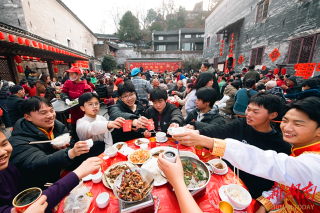 红灯笼映着青石板,新年味溢满古商城。2月11日南方小年,洪江古商城留园内热闹非凡,“洪福洪江年·小城过大年”系列活动之“洪商福宴”正在举行,40张大圆桌整齐排列,古城居民与游客欢聚一堂,在市井烟火中品味洪江的年味与温情。