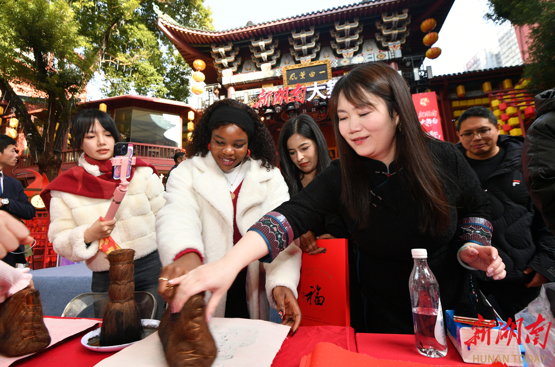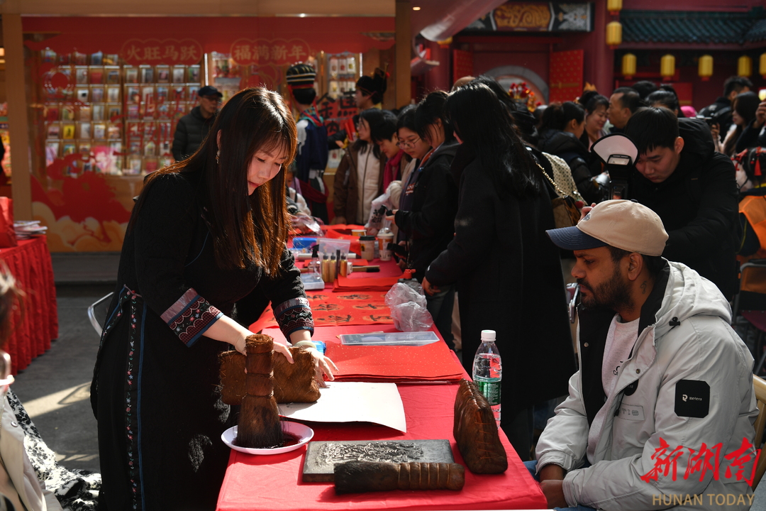 古浏阳门、火宫殿、东茅街等地,写春联、贴年画、祭祀祈福等年俗活动接踵而至,一场由新湖南客户端指导发起、长沙市芙蓉区文旅体局主办、湖南省圆点美术馆承办的“开门见喜 福满星城”2026长沙新年画城市共生计划如约启幕。国家级非遗代表性项目滩头木版年画市级代表性传承人钟星琳携作品《马上报喜》亮相活动现场,以年画为媒,与市民游客、国际友人共赴一场非遗年味之约。
