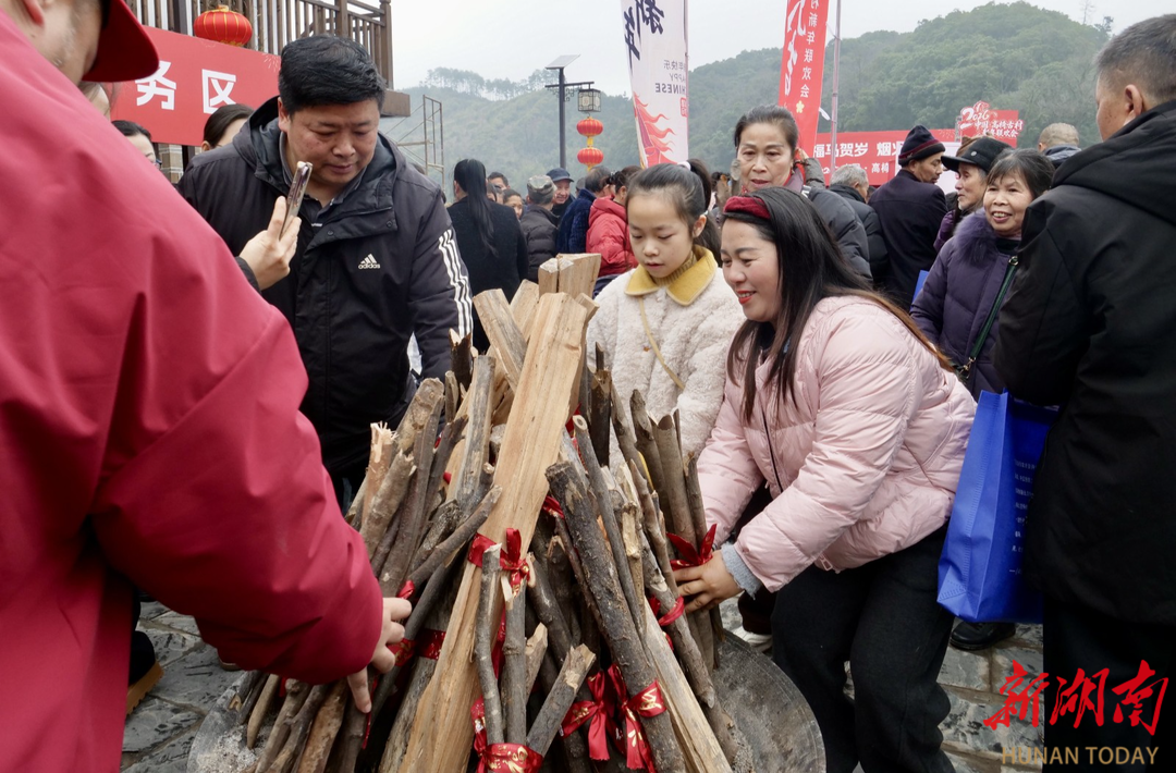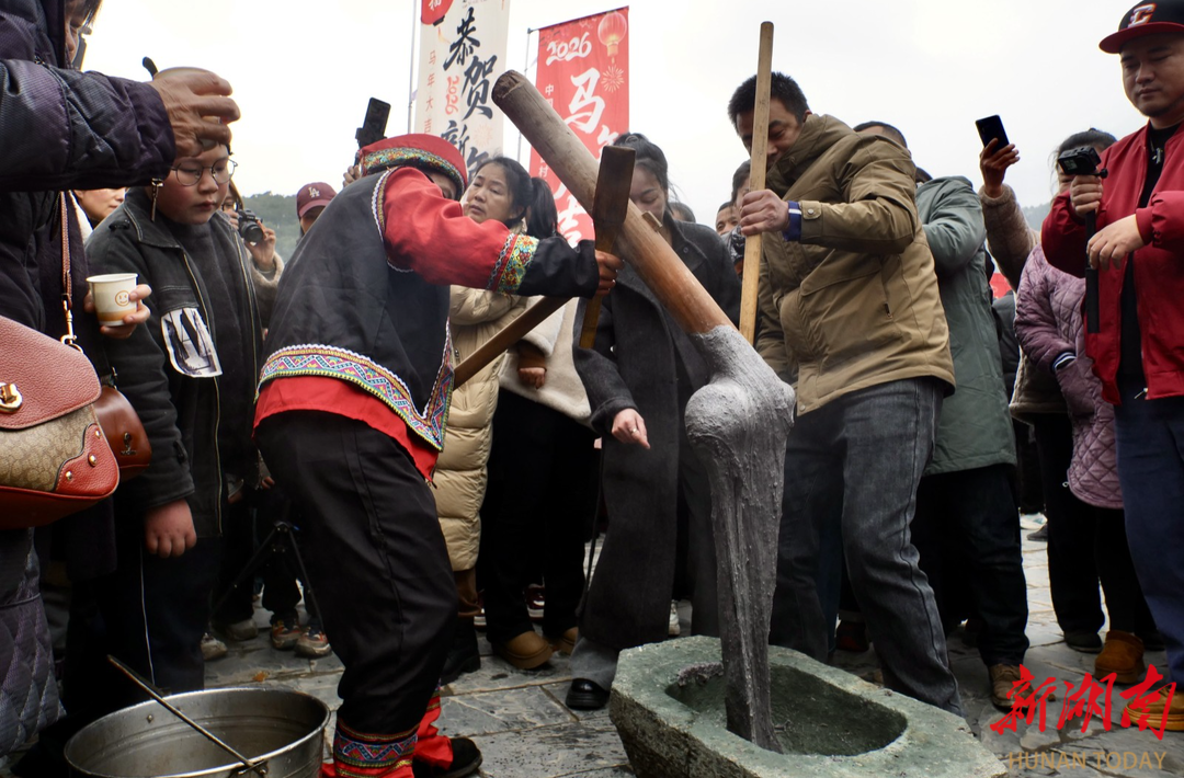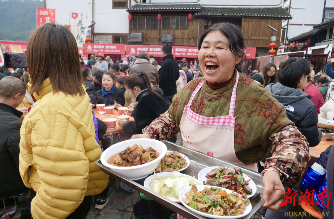 新年的仪式感,藏在最质朴的民俗里。添柴加薪祈福,游客执柴入火塘,一句“岁岁红火”,把新年期盼烧得滚烫;杀年猪、庖汤宴等轮番开场,游客与村民围坐一桌,热汤暖胃,笑语暖心,这是童年里最真切的年的模样。“从浙江带娃赶来,打糍粑、看表演、吃庖汤,这才是过年该有的热闹!”浙江游客杨庆抱着孩子,满眼都是幸福。