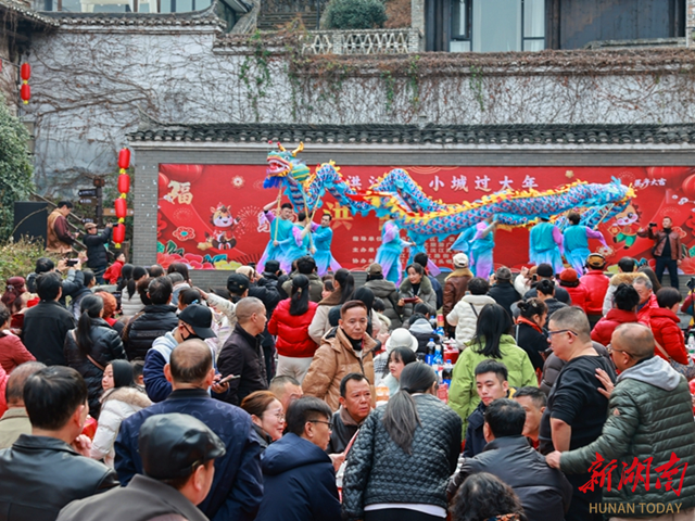 怀化市非物质文化遗产代表性项目“草龙”穿梭于宴席现场,给游客和市民送上祝福。“吃商帮菜,发天下财”“弟兄好、四季财、六六顺……”吆喝声、划拳行酒令的欢笑声四起,交织成一幅热闹非凡的新春画卷。