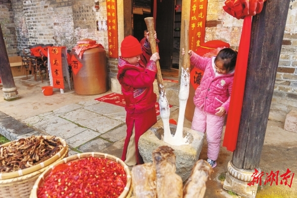 春节前夕,双湾村刘家大院,小朋友在体验打糍粑。