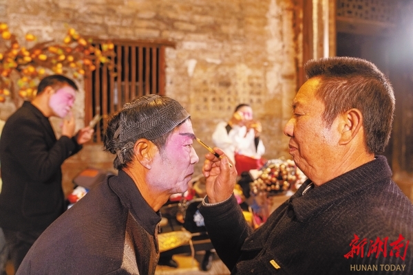 马灯戏第四代传承人廖伦霜(右一)在为演员化妆。