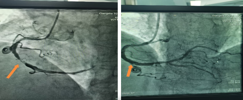时间就是心肌,时间就是生命。接到通知,医院立即启动胸痛中心应急预案。患者抵达医院时,仍反复胸痛不止。在与家属进行简短有效沟通后,患者被送入介入治疗室。术中造影显示,患者最重要的供血血管之一——右冠中段完全闭塞,情况十万火急。