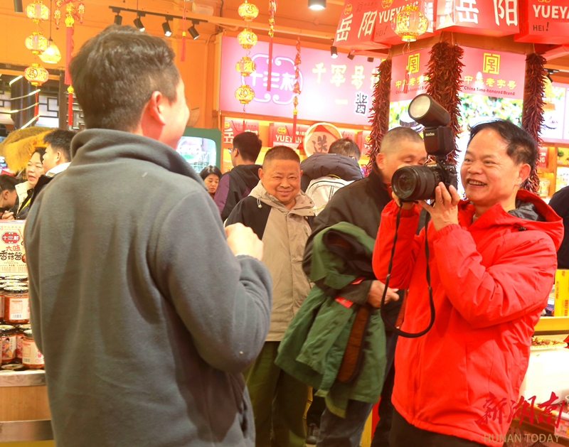 被誉为“笑脸哥”的“非遗”守护人、全国道德模范李国武也放弃休息,到“十三村”特产店开展“拍笑脸送顾客”的暖心互动。他手持相机穿梭于顾客之间,镜头对准一张张开怀的笑脸,润物无声,让顾客从购物喜悦到享受“场景”,沉浸体验岳阳非遗美食之快乐。