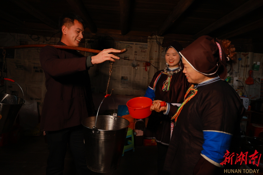 14时,上岩村的讨酒队伍正式出发。侗族小伙们手持鲜花与礼品,前往心仪姑娘家讨“地瓦”喜酒。“姐姐的笑容比米酒还甜,求一杯喜酒沾沾福气!”“我是认真的,求给个机会!”一句句幽默逗趣的告白,惹得围观村民捧腹大笑。