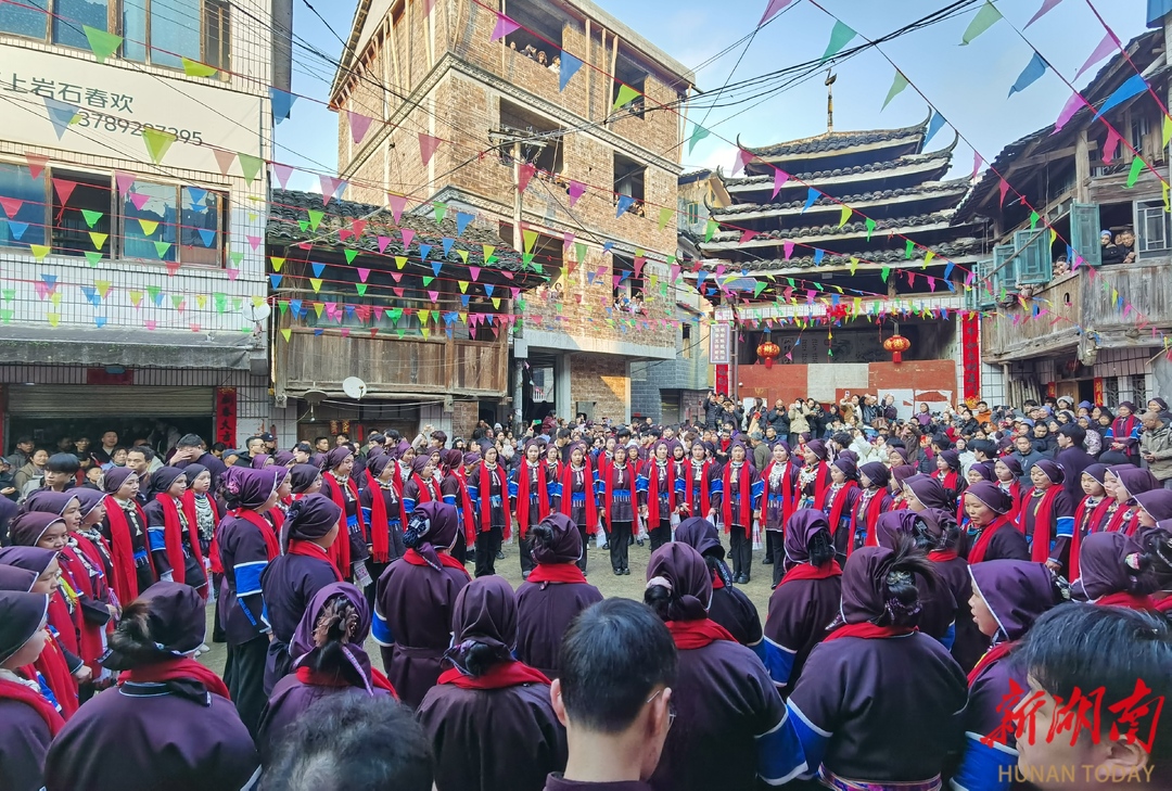 湖南日报·新湖南客户端2月20日讯(记者 黄欣然 通讯员 吴祥淼 杨新鸿 王德霖)2月19日,大年初三,通道侗族自治县独坡镇上岩村人潮涌动,芦笙声声迎客来。来自湘桂黔三省(区)交界处的青年男女与数千名游客齐聚一堂,同歌共舞欢庆“月地瓦”。
