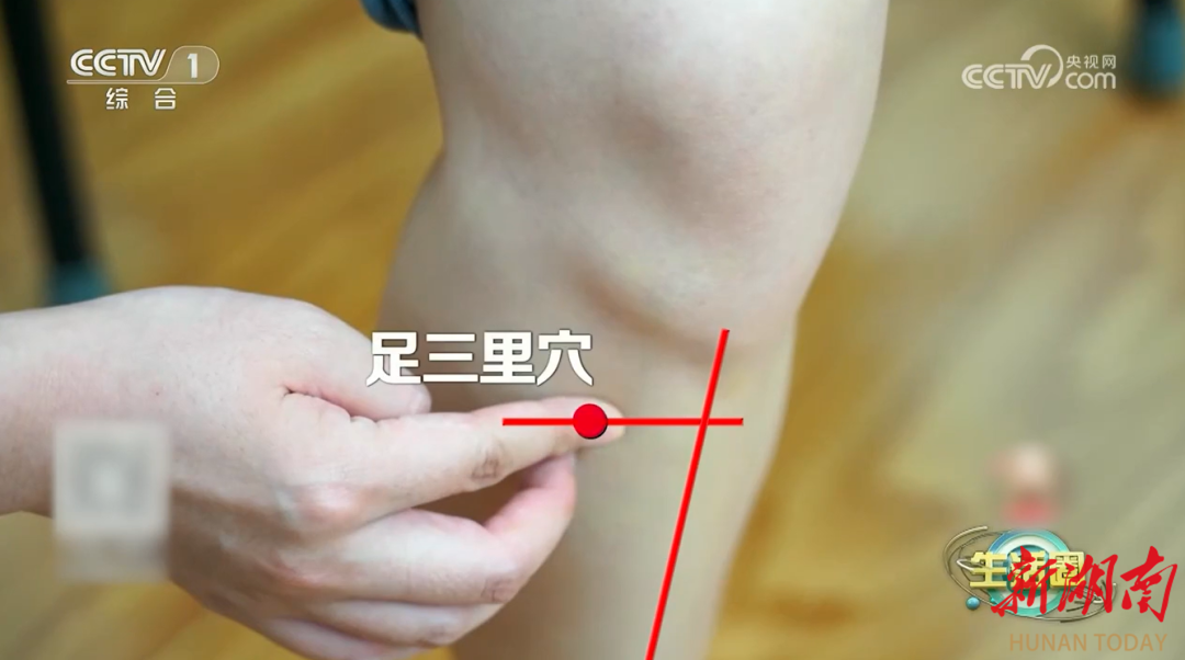足三里是人体自带的“健脾穴”。屈膝时,膝盖外侧凹陷处为犊鼻穴,下面4横指的距离做个标记,距胫骨外侧1横指的距离就是足三里穴。长按足三里穴能够健脾和胃助消化,提升正气。