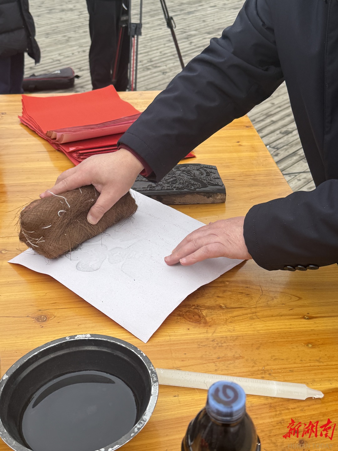 当高高的红灯笼次第亮起,花瑶古寨的夜色便被彩灯的星点柔光轻轻托起。钟建桐从袋子里捧出那套祖传的雕版,动作轻缓得像在迎接一位老友。研墨、刷版、铺纸、按压,一套流程行云流水。待墨色徐徐浸透纸背,他屏息将年画揭起,举到胸前——门神的轮廓凛凛生动。围观的村民发出一片低低的赞叹,他站在其中,笑得像个孩子。