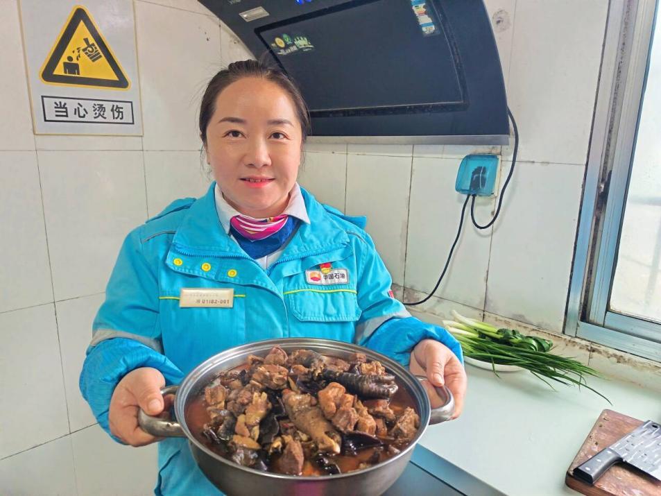 腊月二十九清晨,天刚蒙蒙亮,中国石油湖南销售公司湘西旅游加油站的厨房里已是热气腾腾。站经理覃竹元提着满满一袋新鲜食材快步走进厨房,鸡鸭鱼肉、苗家酸菜一应俱全,氤氲的烟火气驱散了冬日的寒意。