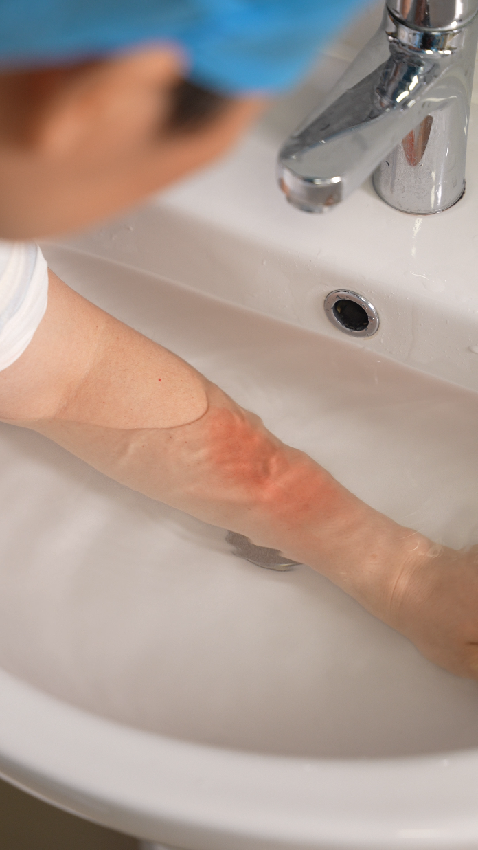 冲洗后小心脱去烫伤部位的衣物、饰品,若衣物与皮肤粘连,切勿强行撕扯,可用剪刀剪开周围衣物,保留粘连部分,防止撕脱皮肤、扩大创面。