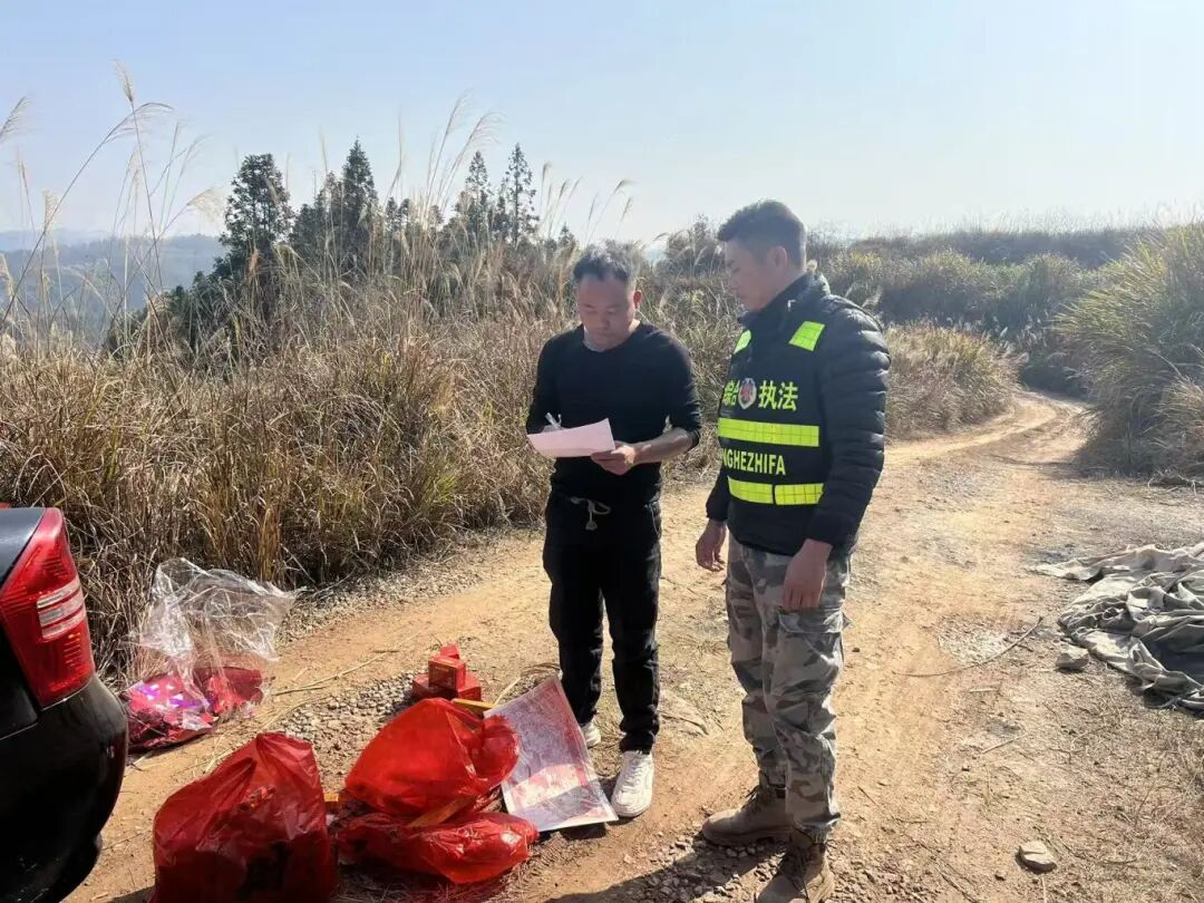 2月16日,汝城县应急管理在集中燃放点开展值守工作,依法打击烟花爆竹违法销售和劝阻不规范燃放行为。