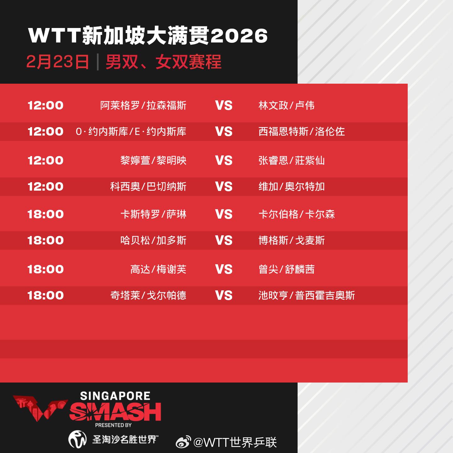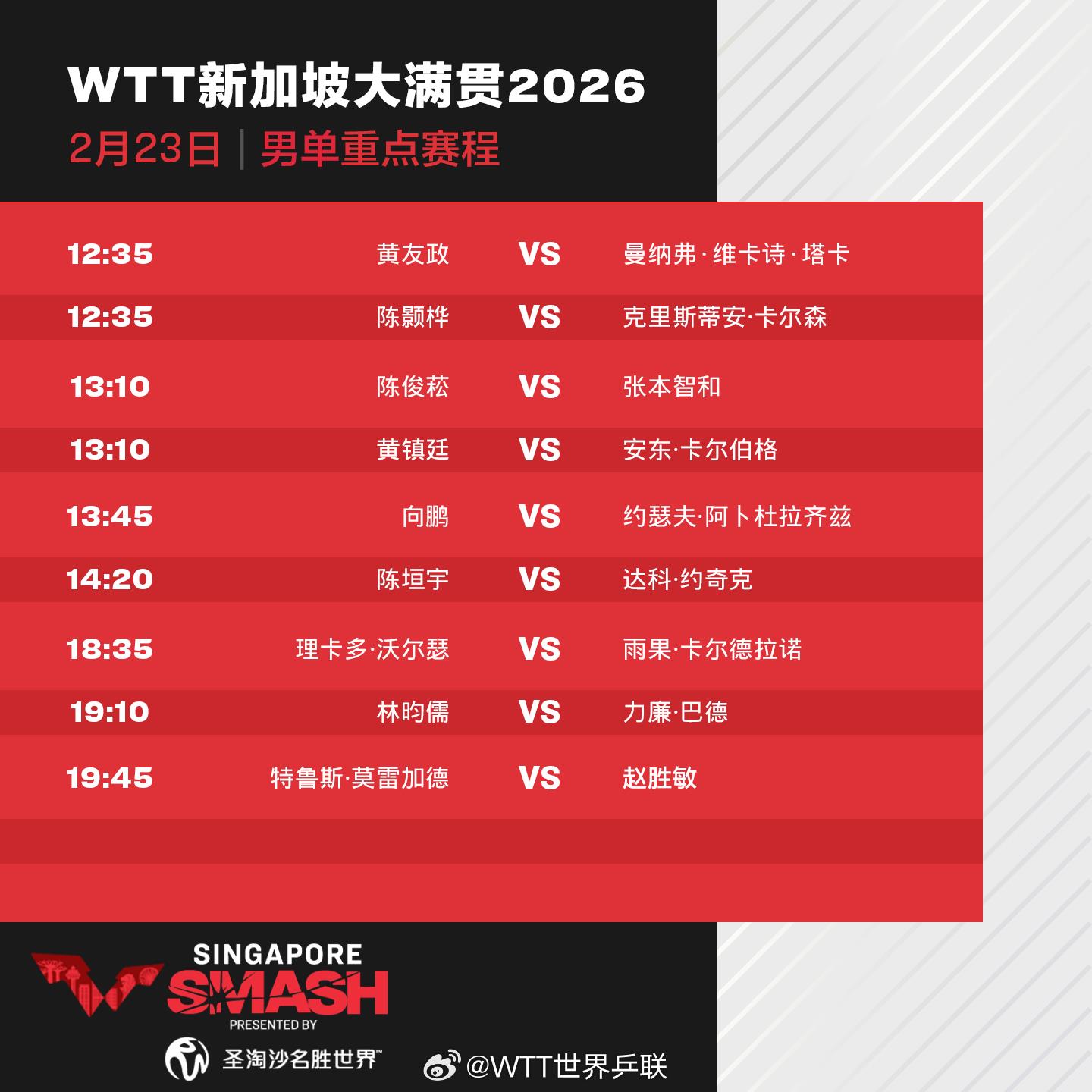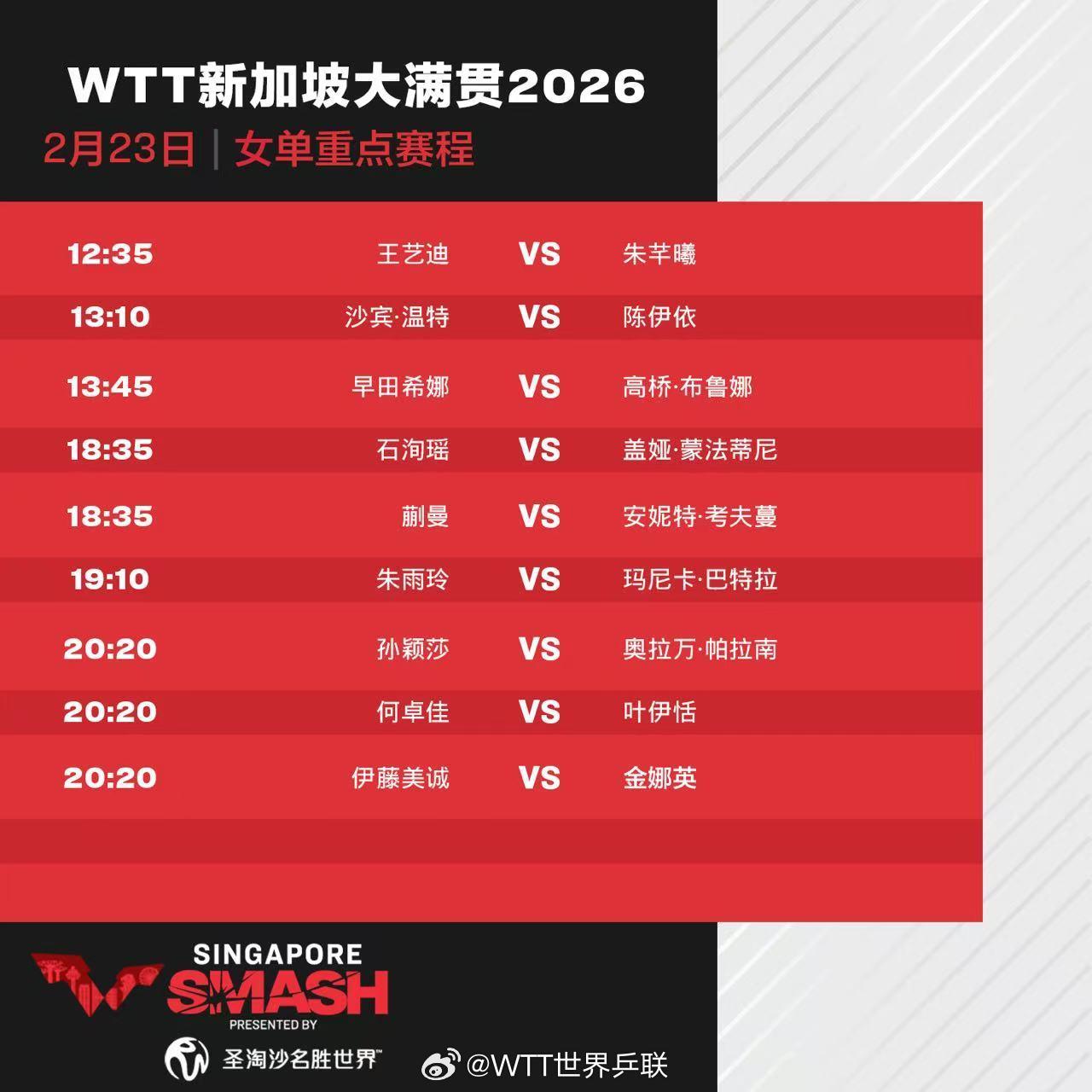今天(23日),2026年WTT新加坡大满贯进入正赛第二天,孙颖莎、蒯曼、王艺迪、向鹏和陈垣宇等出场。具体赛程如下: