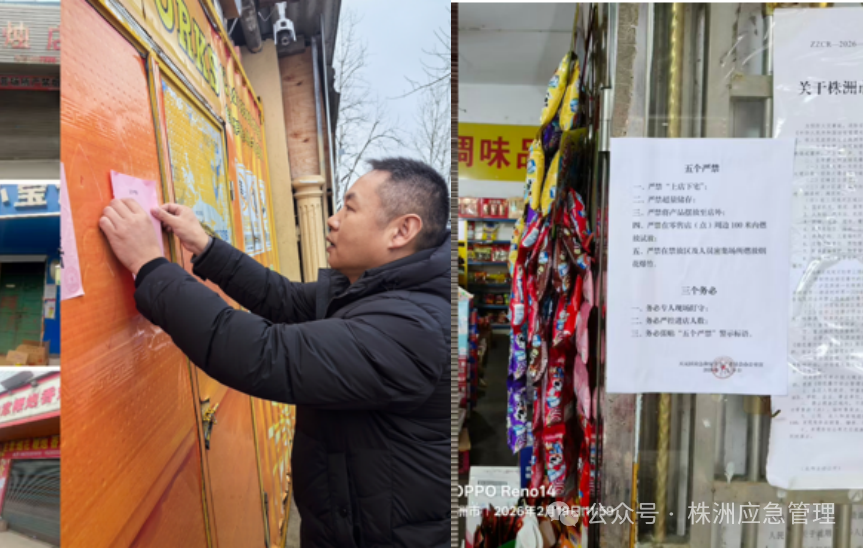 2月19日,天元区组织各乡镇(街道)对烟花爆竹零售门店进行检查,并在各门店张贴“五个严禁、三个务必”安全提示。