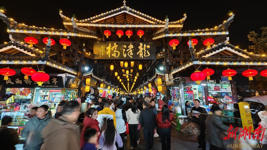 龙津风雨桥上游人如织,飞檐翘角间红灯高挂,古桥与碧水相映成趣,一步一景皆是浓浓年味。市民游客倚栏观景、拍照留影,尽情感受侗乡地标独有的韵味。飞虎风情街非遗市集热闹非凡,沅州石雕、芷江白蜡等非遗技艺现场展演,古老手艺在新春焕发新生;芷江鸭、侗乡酸萝卜、油茶等特色美食香气四溢,舌尖上的侗乡风味让游客流连忘返。春节期间,该市集累计接待游客9.5万人次,文旅消费突破1200万元。