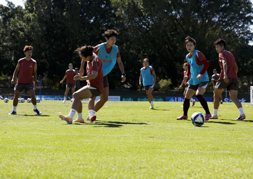 上午的灿烂阳光斜斜地洒在草坪上,映衬着碧蓝的天空。中国女足姑娘们正在场上进行战术演练,澳大利亚籍主教练米利西奇的指挥声,与队员们的呼喊声此起彼伏,绿茵场上充满了拼搏与专注的气息。