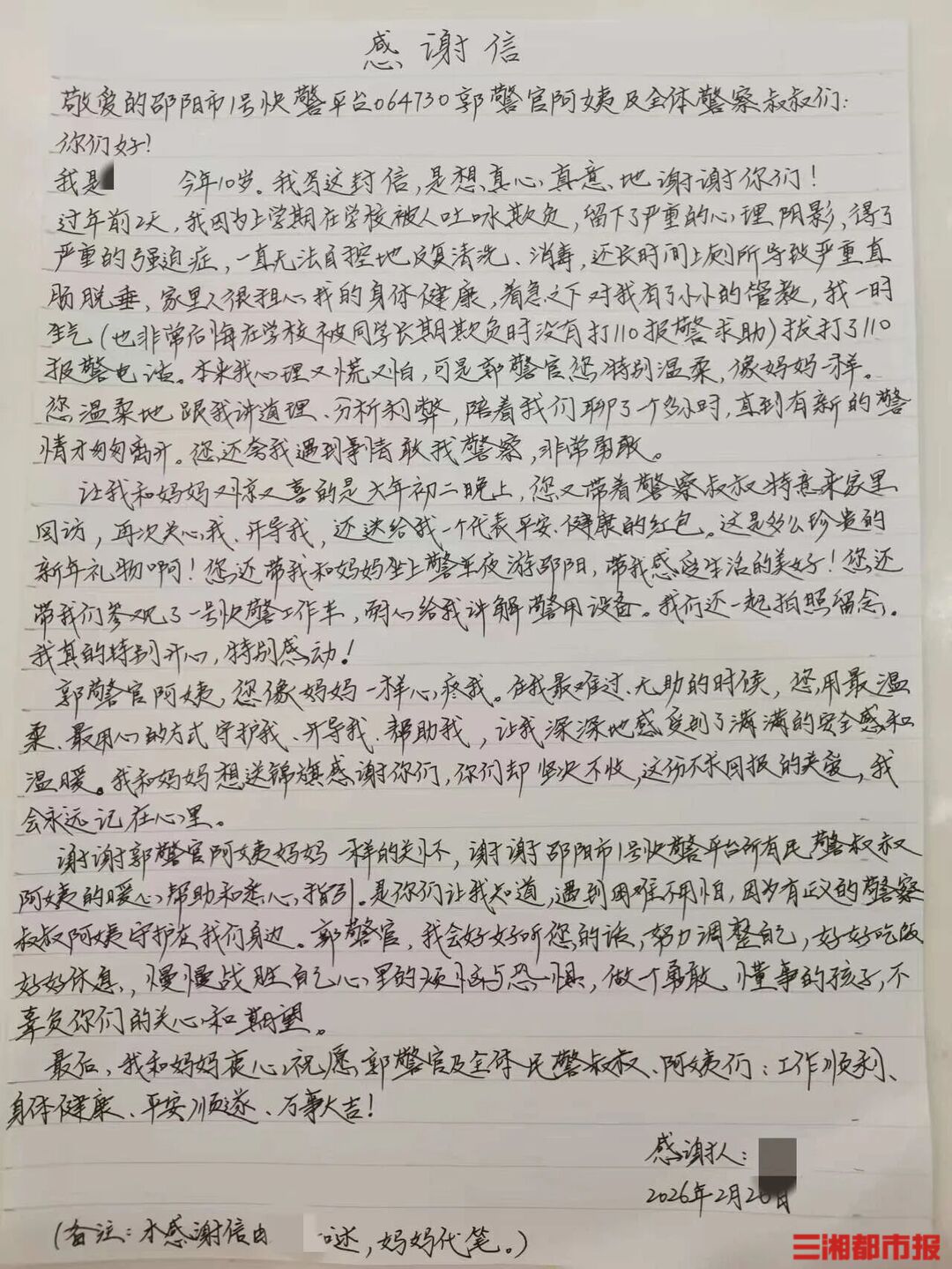 三湘都市报·新湖南客户端2月27日讯(全媒体见习记者 刘文)近日,邵阳快警北塔1号平台收到一封特殊的感谢信,落款是一名10岁小男孩。信中写道:郭阿姨像妈妈一样心疼我,在我最难过的时候用最温柔的方式守护我。2月27日,记者采访了这位“警察妈妈”郭晓慧,听她讲述了一段温情故事。