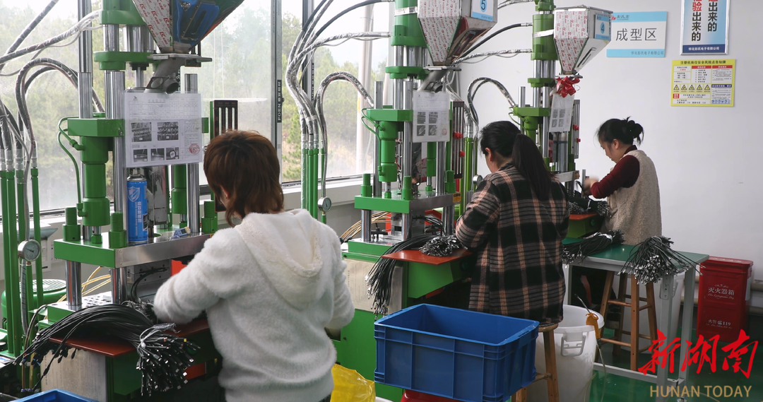 紧邻的怀化彭氏电子公司车间内同样热火朝天。4 条数据线生产线高速运转,包装台上,工人们正忙着将成品打包发货。