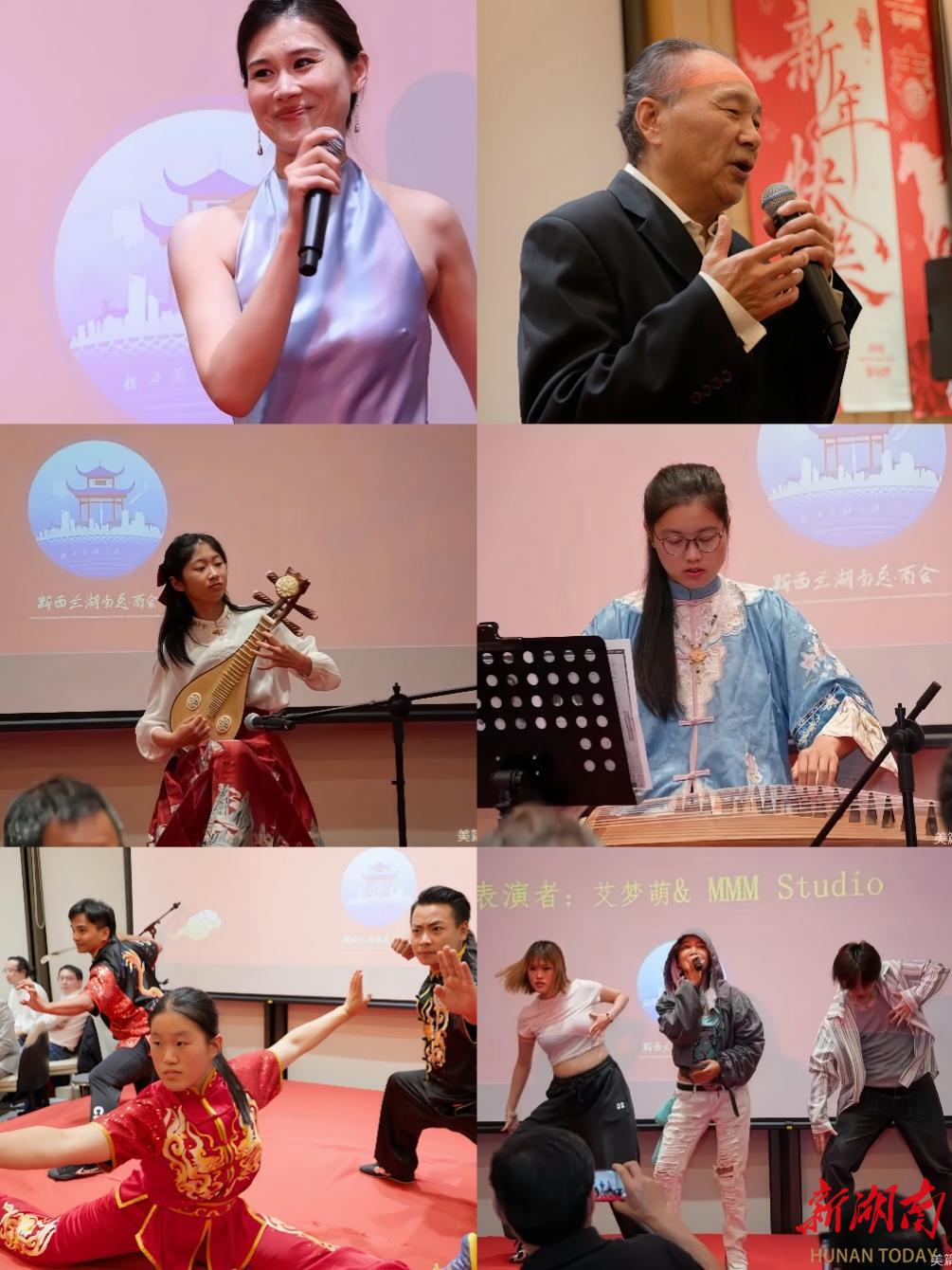文艺演出精彩纷呈,高潮迭起。男高音歌唱家孟建宏带来的《飞吧小夜曲》《草原之夜》以浑厚嘹亮的嗓音震撼全场,女高音崔木子 演唱的《龙船调》《万事如意》则以细腻动人的演绎赢得阵阵掌声;四人武术表演刚柔并济、气势如虹,展现中华武术的独特魅力;柳琴与古筝合奏《金蛇狂舞》《浏阳河》旋律悠扬、韵味悠长;歌手艾梦萌带来的劲歌表演更将现场气氛推向高潮,掌声与欢呼声此起彼伏。