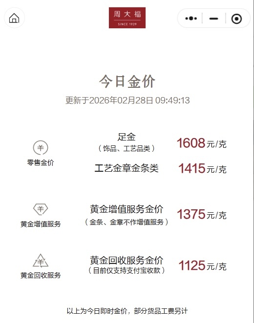 (2月28日周大福金价1608元/克。侃财君截图)