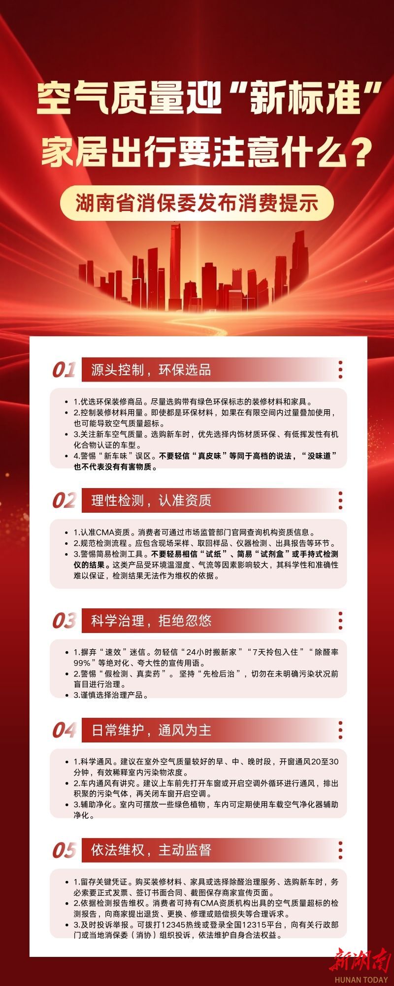 近日,生态环境部与国家市场监督管理总局联合发布《环境空气质量标准》(GB 3095—2026)及两项配套技术规范,进一步收严污染物浓度限值,为公众健康防护划定更高标准。为帮助消费者科学防范家居、出行中的环境污染,维护自身合法权益,湖南省消费者权益保护委员会(简称“省消保委”)发布消费提示,聚焦五大核心要点,引导群众把好健康关。