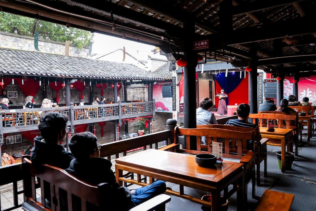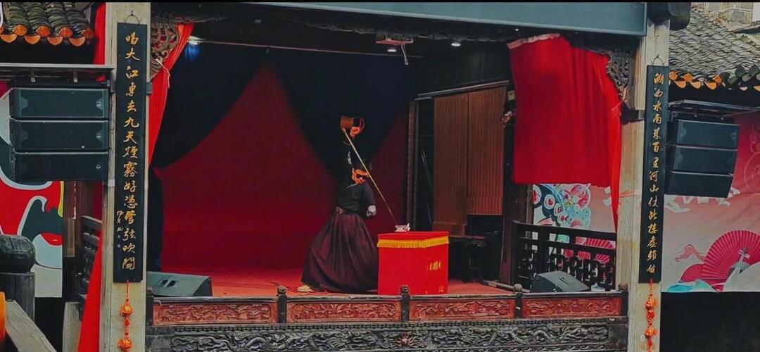 “ 非遗节目+NPC行进式演艺 ”模式,让整个古镇变成了一个巨大的沉浸式剧场。园区入口,国际学生争先恐后地与“财神 ”互动,用中文各显神通,唱中文歌、背诵古诗,以及表演武术,引得财神拍手喝彩,并为同学们派发纪念品和游戏纸币作为奖励。八元堂(宁乡会馆)古色古香的戏台上,功夫茶艺表演者手持长嘴铜壶,腾挪翻转间,一股滚烫的热水精准地注入方寸之间的茶碗,引得国际学生连连赞叹:“好厉害!这不仅是茶艺,更是功夫!”而当川剧变脸艺人走下场,与学生互动并在瞬间变幻出不同脸谱时,现场爆发出热烈的掌声和惊呼声。