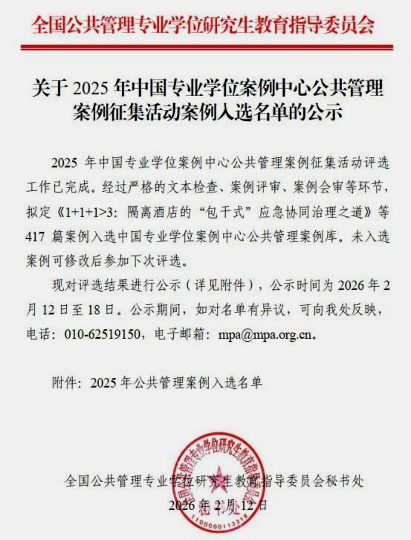 近日,教育部全国公共管理专业学位(MPA)研究生教育指导委员会公布2025年中国专业学位案例中心公共管理案例库入选名单,湖南中医药大学选送的两篇案例双双成功入选,实现了该校国家级公共管理教学案例“零的突破”,标志着该校公共管理学科建设与教学改革迈上了新台阶。