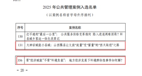 此次入选的两篇案例分别为:由人文与管理学院(MPA教育中心)夏新斌、胡正东老师指导,潘晨曦、李锦璇同学创作的案例《要“经济赋能”不要“环境负能”:地方经济发展下环境群体性事件如何解?》;以及由刘平良、李玲老师指导,肖劭骢、张凯悦、王祺祁同学创作的案例《大神话赋能小县城:山西隰县让文旅“流量”变“留量”的“西天取经”之路》。