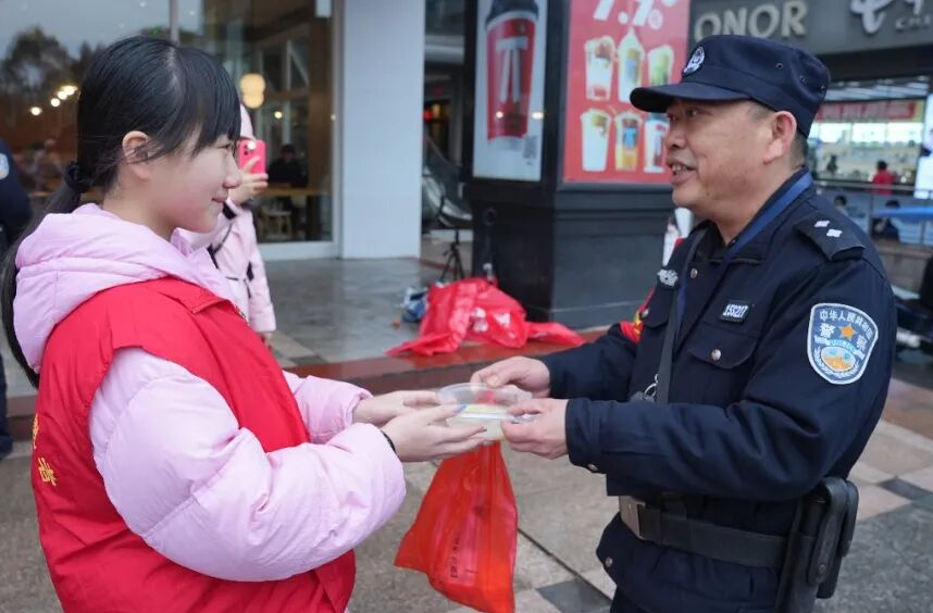 活动现场,亲子家庭和青年志愿者为坚守在一线的新兴青年、环卫工人等户外工作群体送上精心准备的生、熟元宵,让奔波的他们在元宵佳节吃上一口甜糯的汤圆,感受浓浓的节日氛围和来自志愿者们的暖心关怀。