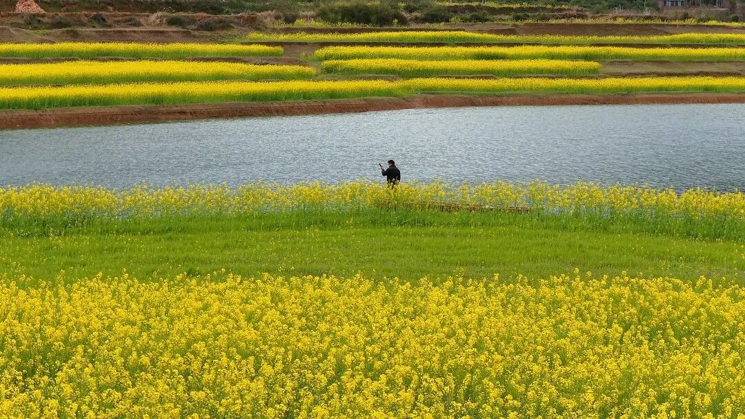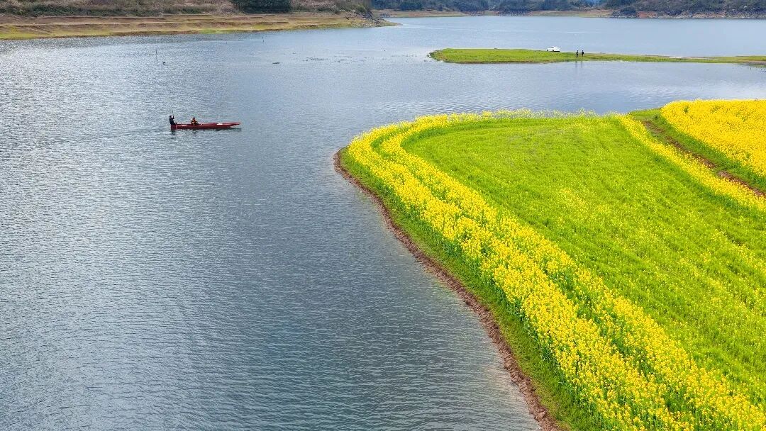 这里的春天,是大片明亮的油菜花。风吹过时,水边的花田与清澈的湖水、绿色的岸边连成一片。