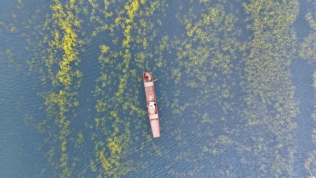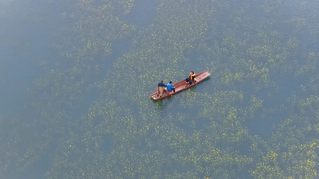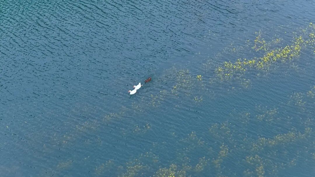由于近期水库区域长期降雨,水位上涨,原本岸边的油菜花田被湖水温柔淹没,形成了罕见的“水中花”景观。