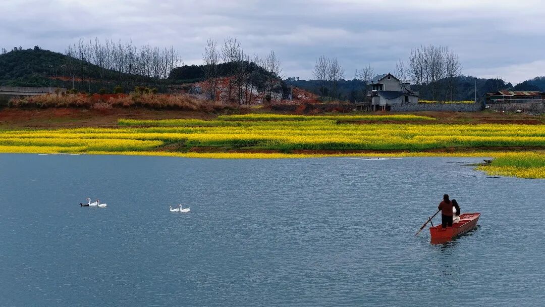 花田环绕着白墙黑瓦的村子,远处有山,天上有云。红船经过,惊起了几只白鹅,有山,有花,有田野,宁静也生动。
