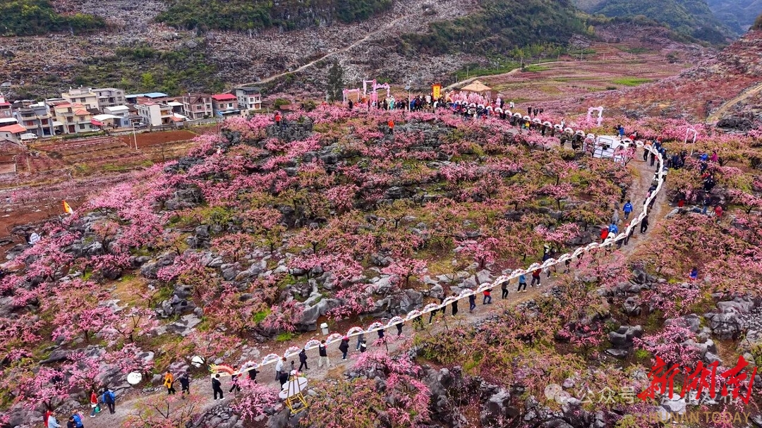 初春,花海丛中,江华瑶族自治县大路铺镇葡萄井村神岗自然村举办传统的“百家神龙宴”,单日参加人数近万人次。