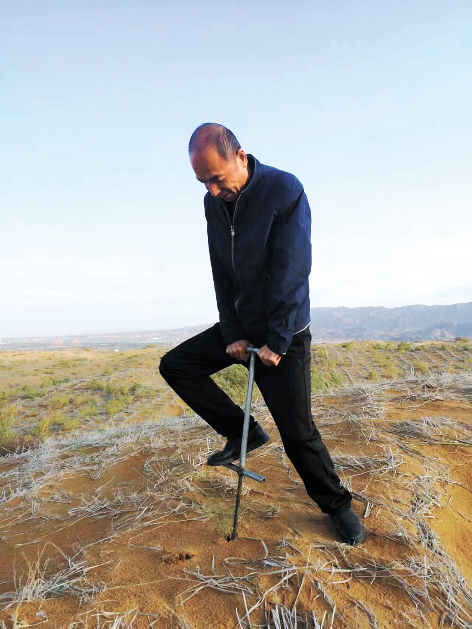 唐希明工作30余年,参与治沙达100万亩,为高86米、坡度达60度的沙地山坡披上绿装,在中卫西北部沙区形成了一道守护中卫的绿色屏障。(唐秀萍)