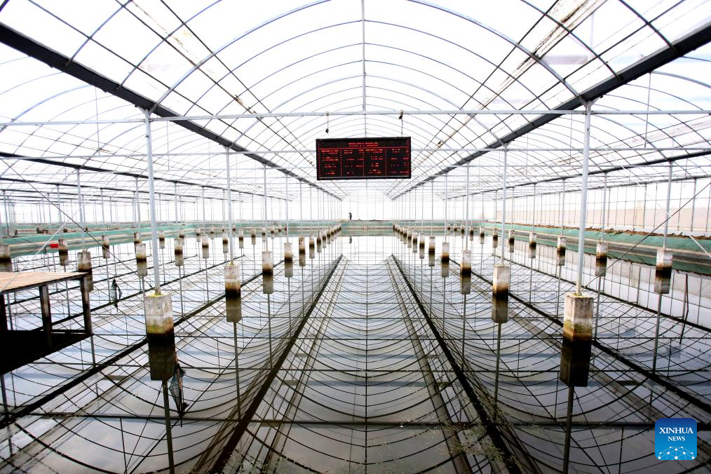 This photo taken on March 27, 2026 shows a breeding greenhouse of a modern agriculture demonstration base for Xuyi crayfish in Xuyi County, east China's Jiangsu Province. A modern agriculture demonstration base for the Xuyi crayfish industry is located in Maba Town of Xuyi County, covering an area of 1,200 mu (80 hectares). With a total investment of 18 million yuan (about 2.639 million U.S. dollars), the demonstration base, formerly a rice-crayfish co-culture base, has been transformed into a seedling breeding center, a standardized rice-crayfish farming base, and a facility for digital agriculture and water-saving irrigation.