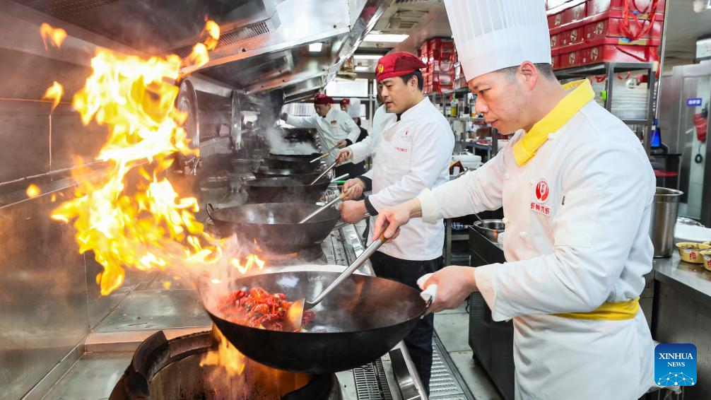 A chef cooks crayfish in Xuyi County, east China's Jiangsu Province, March 19, 2026. A modern agriculture demonstration base for the Xuyi crayfish industry is located in Maba Town of Xuyi County, covering an area of 1,200 mu (80 hectares). With a total investment of 18 million yuan (about 2.639 million U.S. dollars), the demonstration base, formerly a rice-crayfish co-culture base, has been transformed into a seedling breeding center, a standardized rice-crayfish farming base, and a facility for digital agriculture and water-saving irrigation.