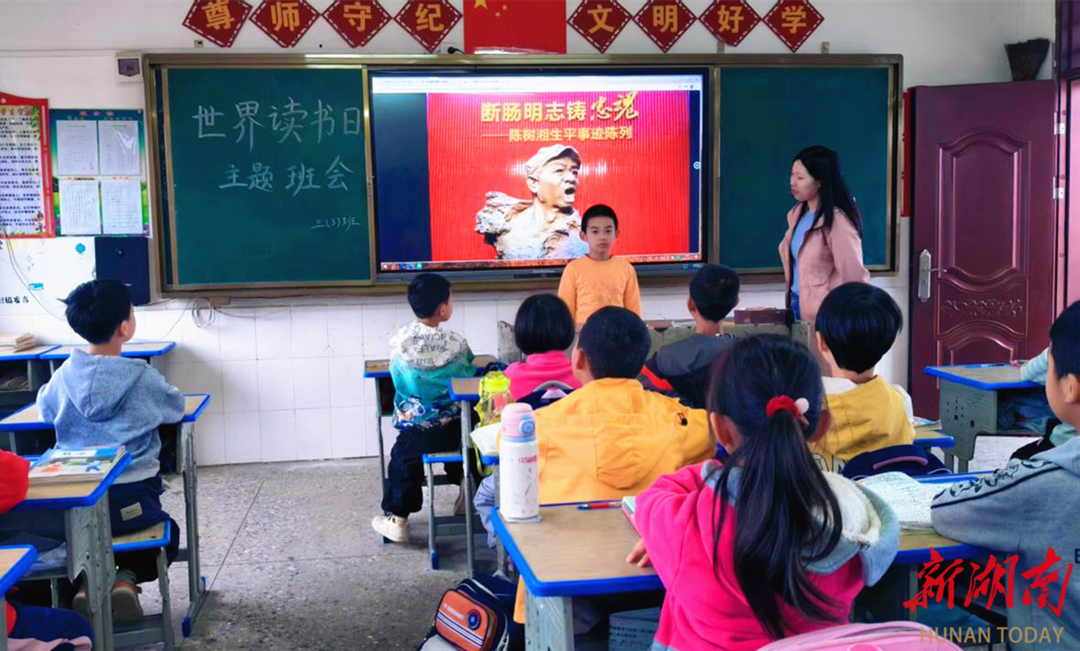 活动当天,各班级围绕主题,分别开展形式多样的阅读活动。其中,三年级3班学生们围坐在教室里,聆听语文教师陈唐娟讲述陈树湘烈士在四马桥的战斗故事。与此同时,五年级2班学生们在语文教师刘玲的带领下集体诵读《爱莲说》,读得格外认真。教师逐句讲解“中通外直”“香远益清”的深意,并讲述周敦颐“官清赢得梦魂安”、拒绝为侄子谋职的廉洁故事。
