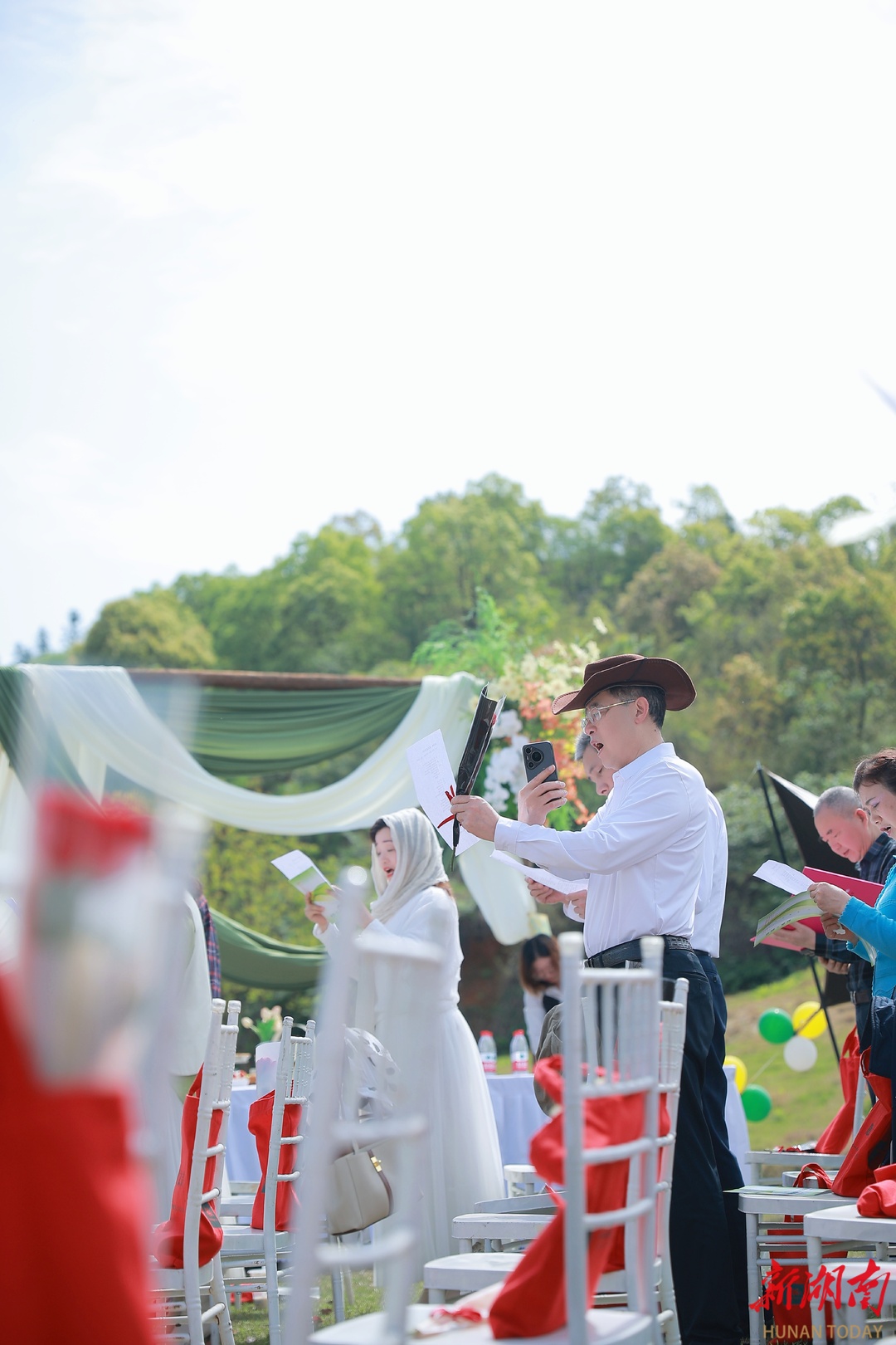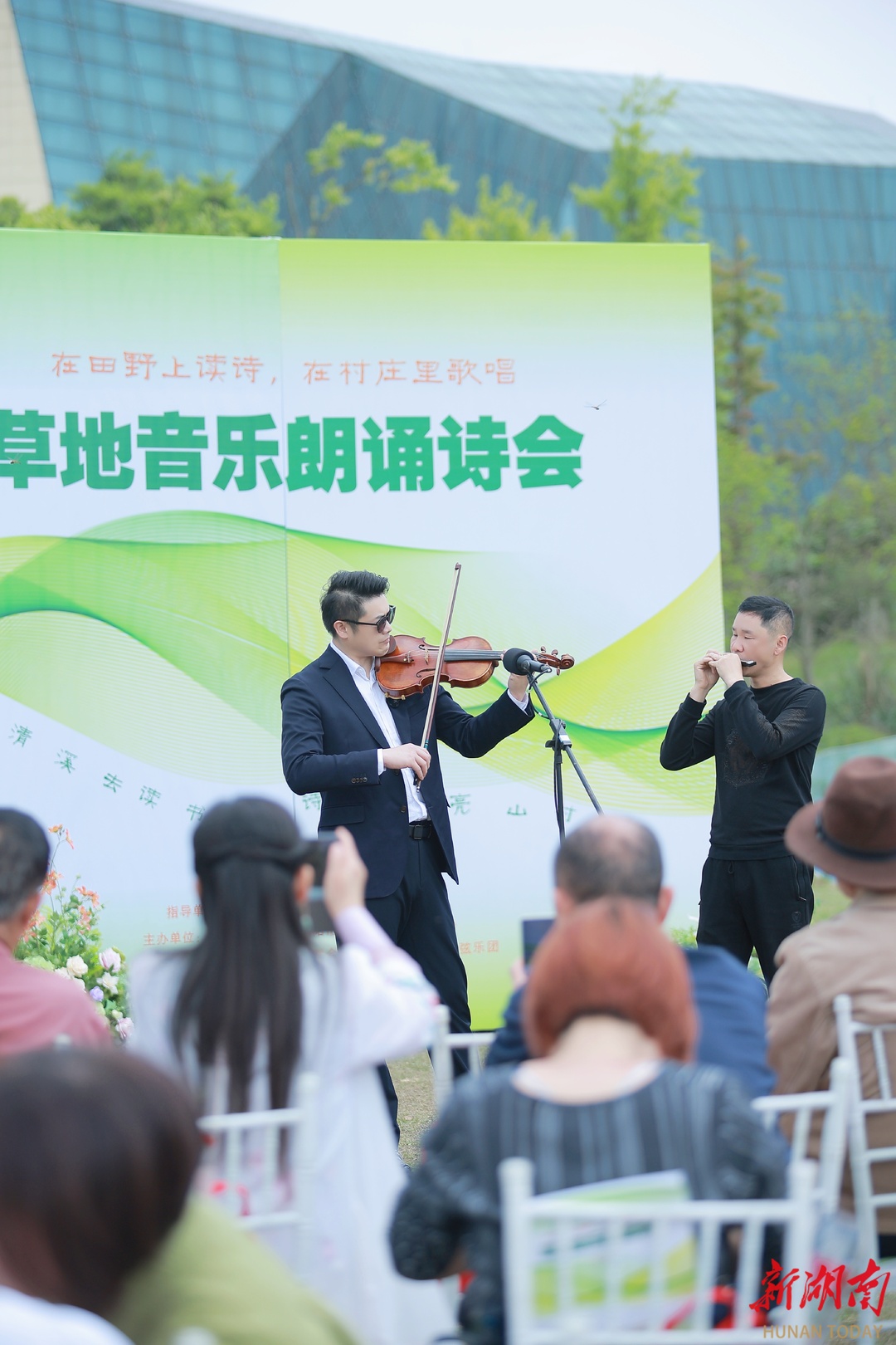 “把舞台搭在草地上、山野间,我感觉诗歌是自由的,风是自由的,人也是自由的。”现场观众傅舰军说,阳光洒在翻飞的诗稿上,清风翻动着每一页。