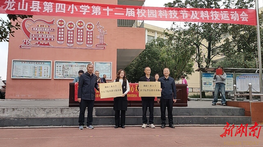 随后,学校举行授牌仪式。湖南工业大学空天技术学院、法学院分别与龙山四小签订合作协议,授牌成立“科教实践基地”与“普法教育基地”,为学校搭建起更广阔的科技与法治教育平台,助力学生全面发展。授牌仪式后,学校宣读了 2025 年度省州县创新大赛获奖名单,为获奖班级与个人颁发荣誉证书,表彰同学们的创新实践成果,树立科创榜样力量。